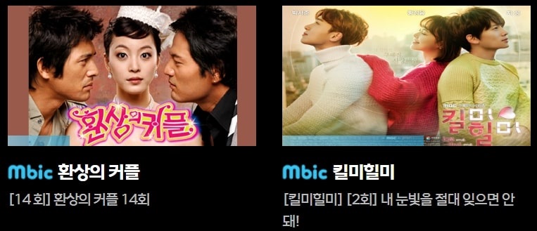 MBC 엠빅라이브 페이지에 방문하시면 24시간 연속 방송으로 환상의 커플을 무료 시청이 가능합니다. 이 곳의 장점은 MBC에서 방영된 인기 드라마 수십 편을 즐길 수 있다는 것으로 다양한 작품들이 올라와 있으니 방문하셔서 보고 싶은 작품을 선택해 시청하시면 됩니다.