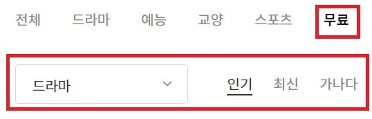 마지막으로 SBS 드라마를 무료로 보시는 방법으로 아래 소개하는 곳으로 방문해 무료 - 드라마를 선택하신 후 "인기-최신-가나다" 설정 후 보고 싶은 작품을 시청하시면 됩니다.