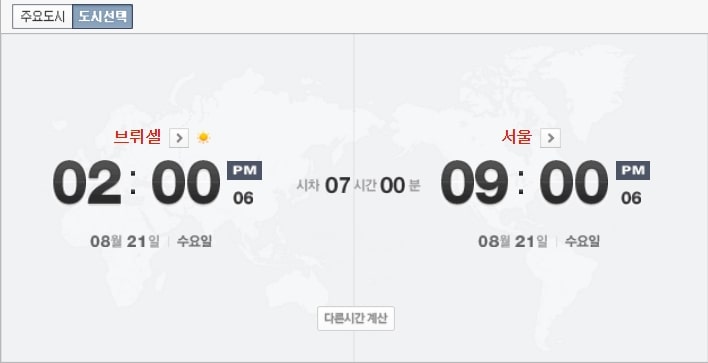 그래서 현재 7시간 시차가 나며, 한국이 오후 9시라면, 벨기에는 오후 2시가 됩니다.