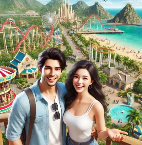 테마파크 안에는 다양한 테마 정원과 인공 호수가 있어 산책을 즐기기에도 좋고, 해변가에서는 파라솔 아래에서 편안하게 휴식을 취할 수 있습니다.