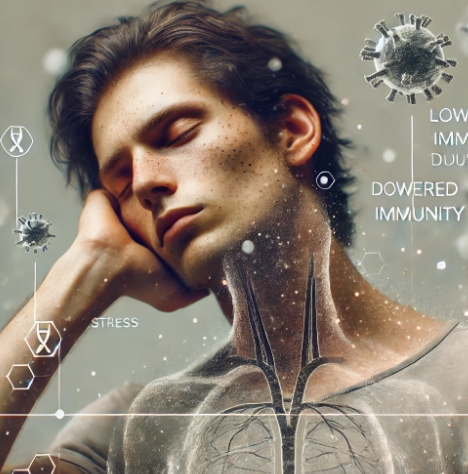 스트레스를 받으면 신체는 코티솔이라는 스트레스 호르몬을 분비하며, 이 호르몬은 면역 기능을 억제하여 신체의 감염 저항력을 떨어뜨립니다.