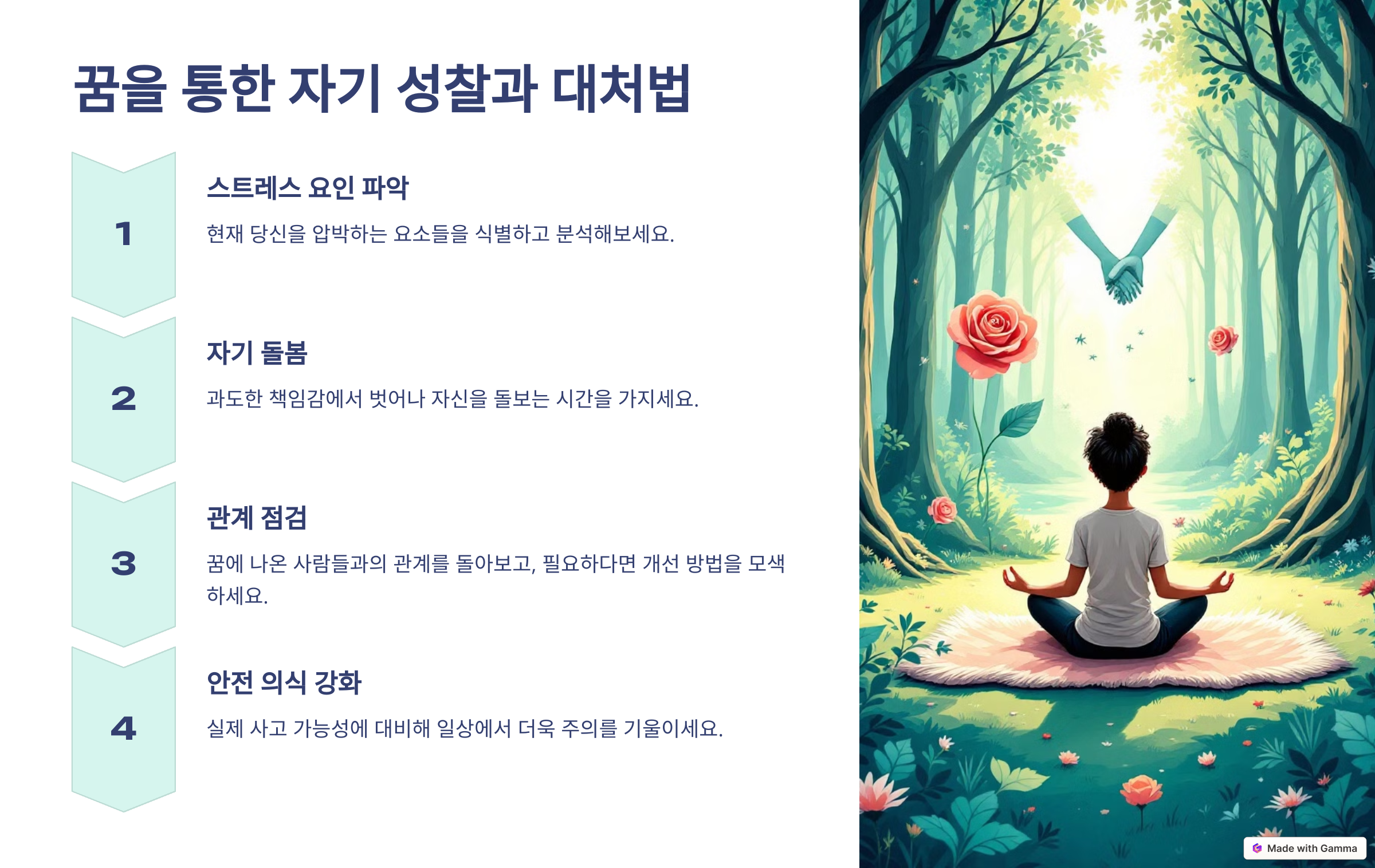 - 관계 점검: 꿈에 나온 사람들과의 관계를 돌아보고, 갈등이 있다면 해결할 방법을 모색하세요.