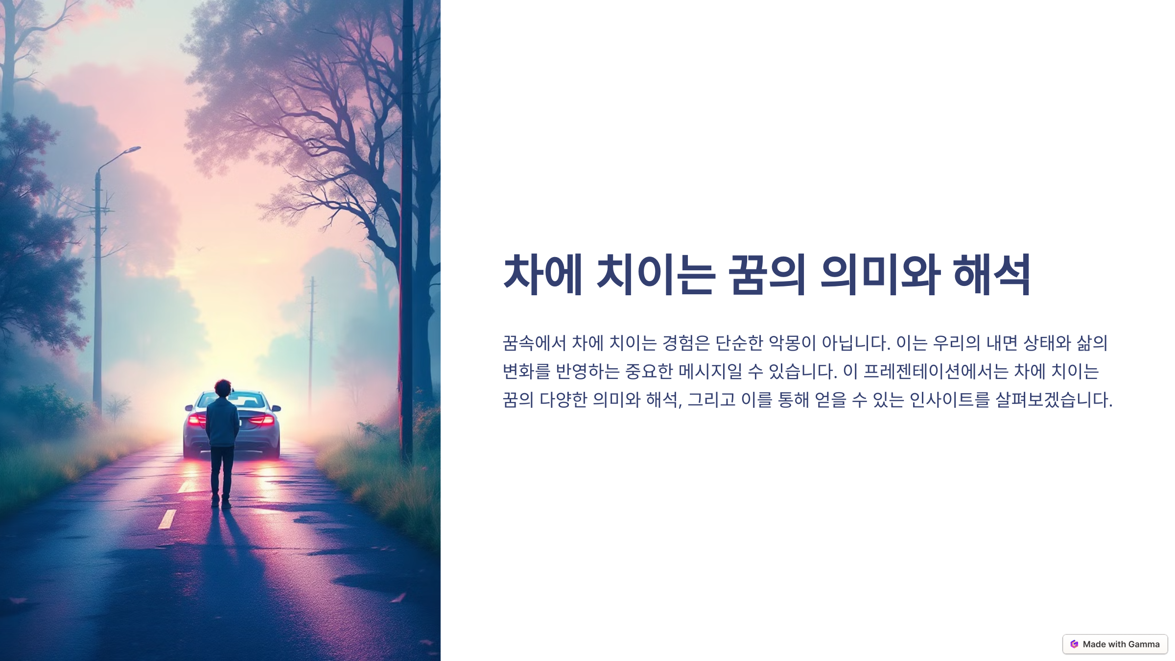 차에 치이는 꿈은 꿈 해몽에서 종종 개인적인 갈등, 스트레스, 또는 급격한 변화와 관련이 있습니다. 일반적으로 이런 꿈은 다음과 같은 의미를 가질 수 있습니다: