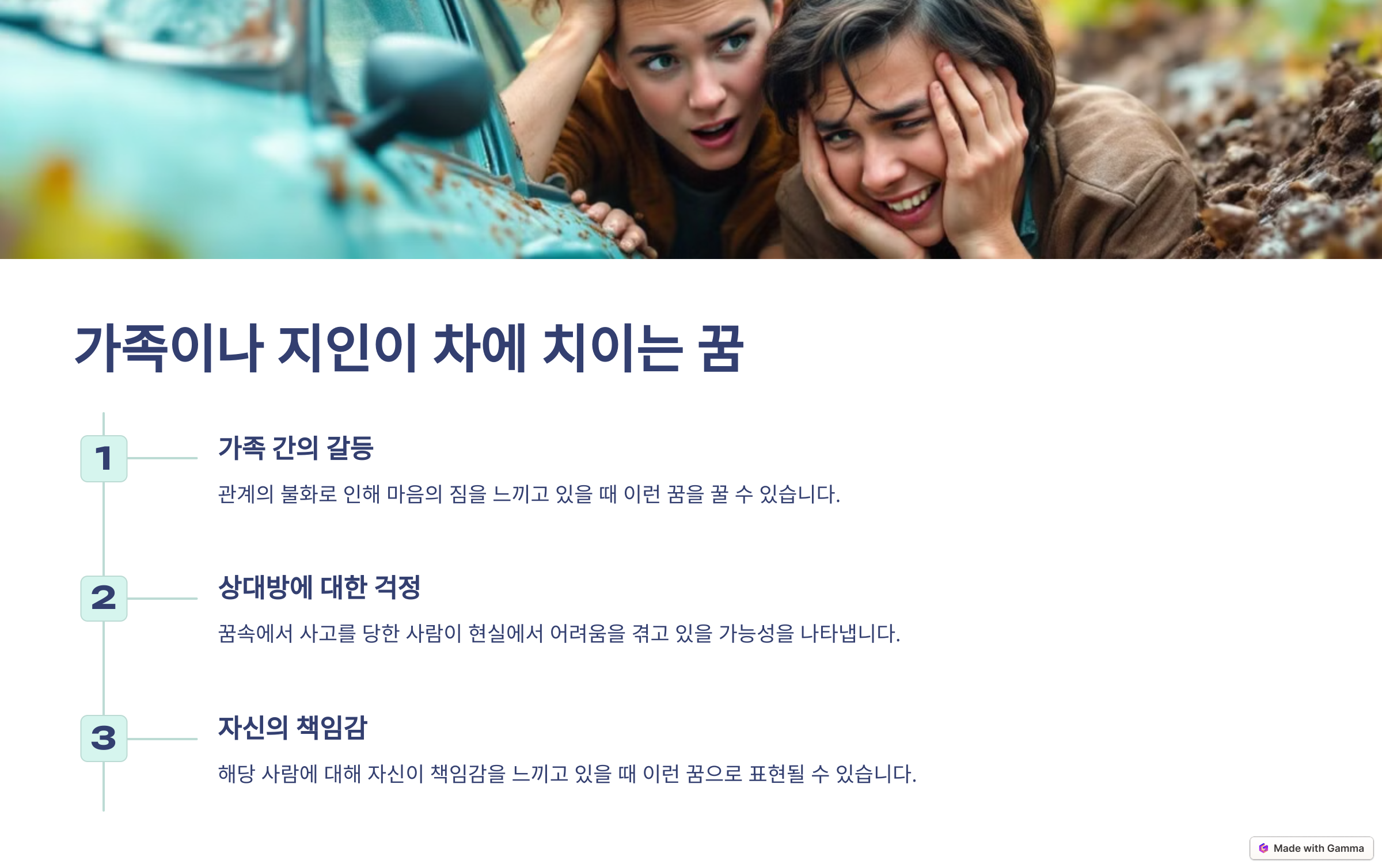 - 과거의 경험: 실제로 사고를 경험했거나 목격한 경우 트라우마로 인해 꿈에서 재현될 가능성이 높습니다.
