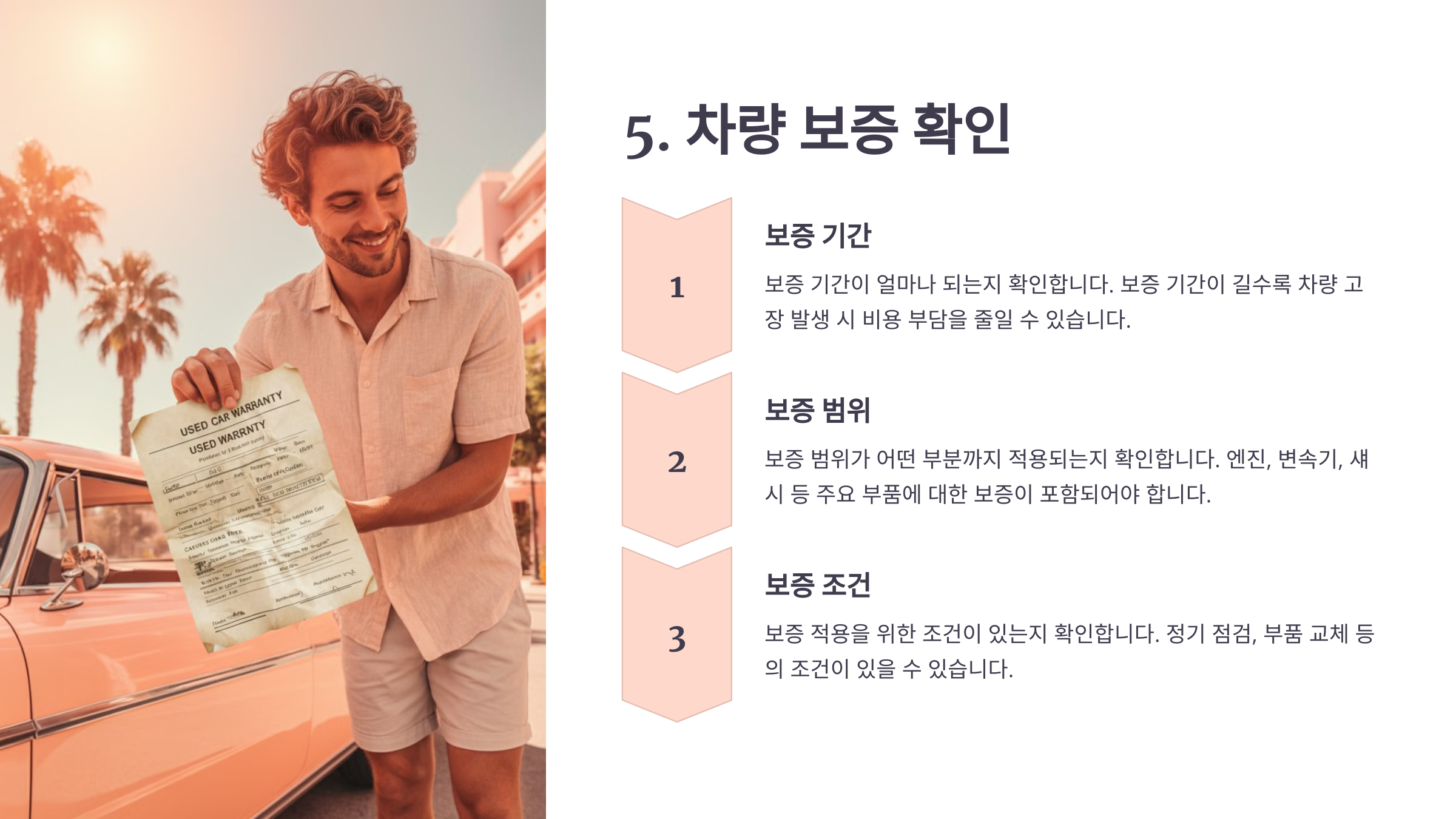- 보증 항목에 엔진, 변속기, 섀시 등이 포함되어 있는지 확인합니다.