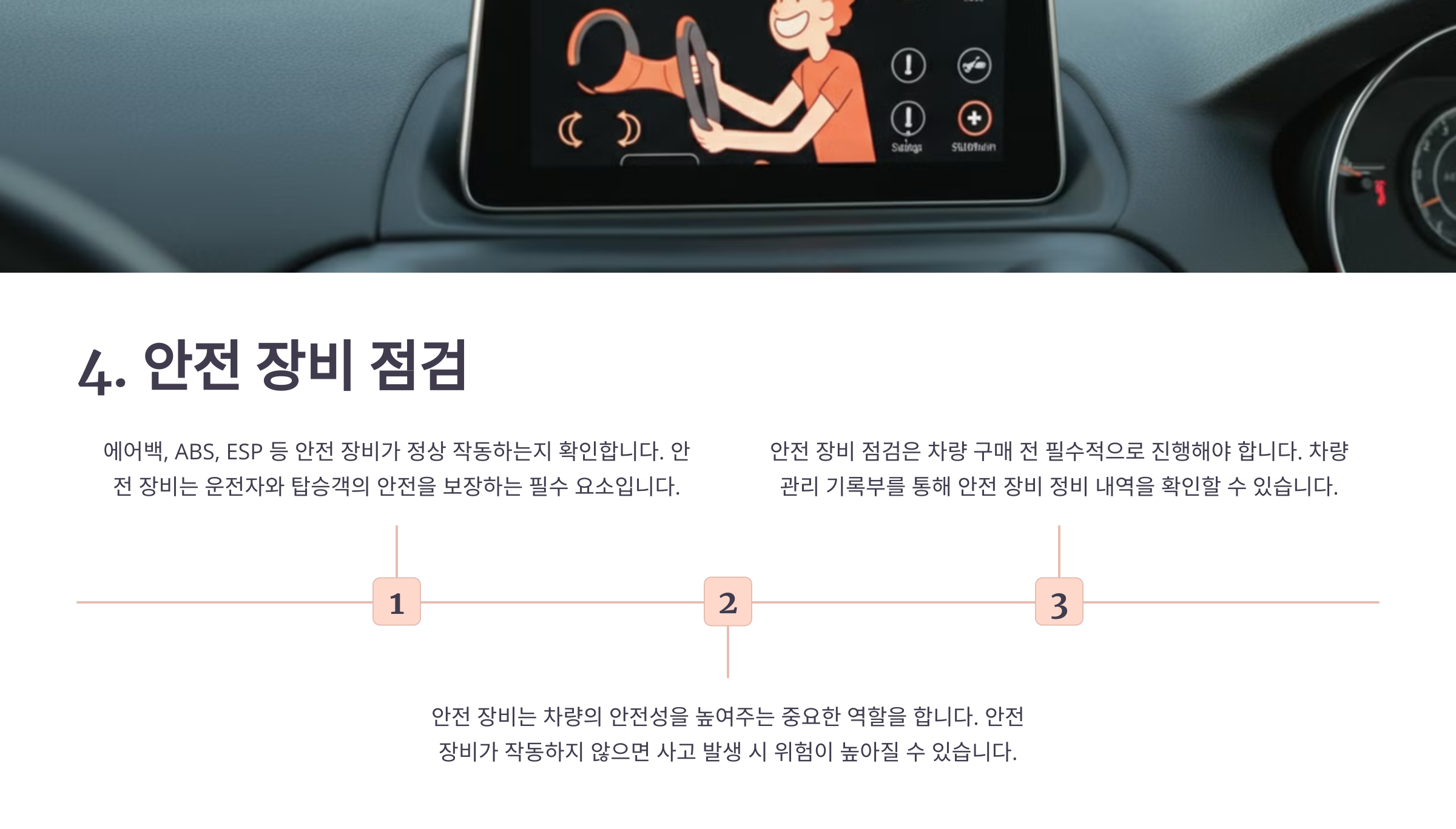 - 에어백, ABS, ESP 등 주요 안전 장비가 정상적으로 작동하는지 확인합니다.