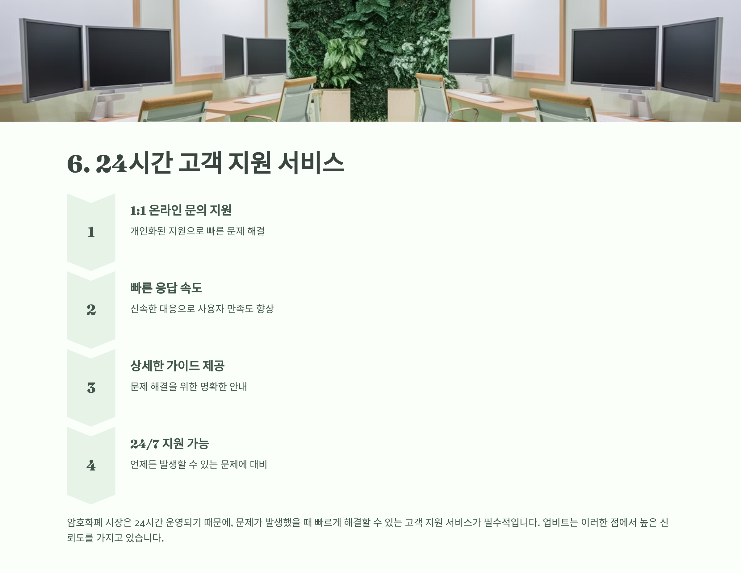 암호화폐 시장은 24시간 운영되기 때문에, 문제가 발생했을 때 빠르게 해결할 수 있는 고객 지원 서비스가 필수적입니다. 업비트는 이러한 점에서 높은 신뢰도를 가지고 있습니다.