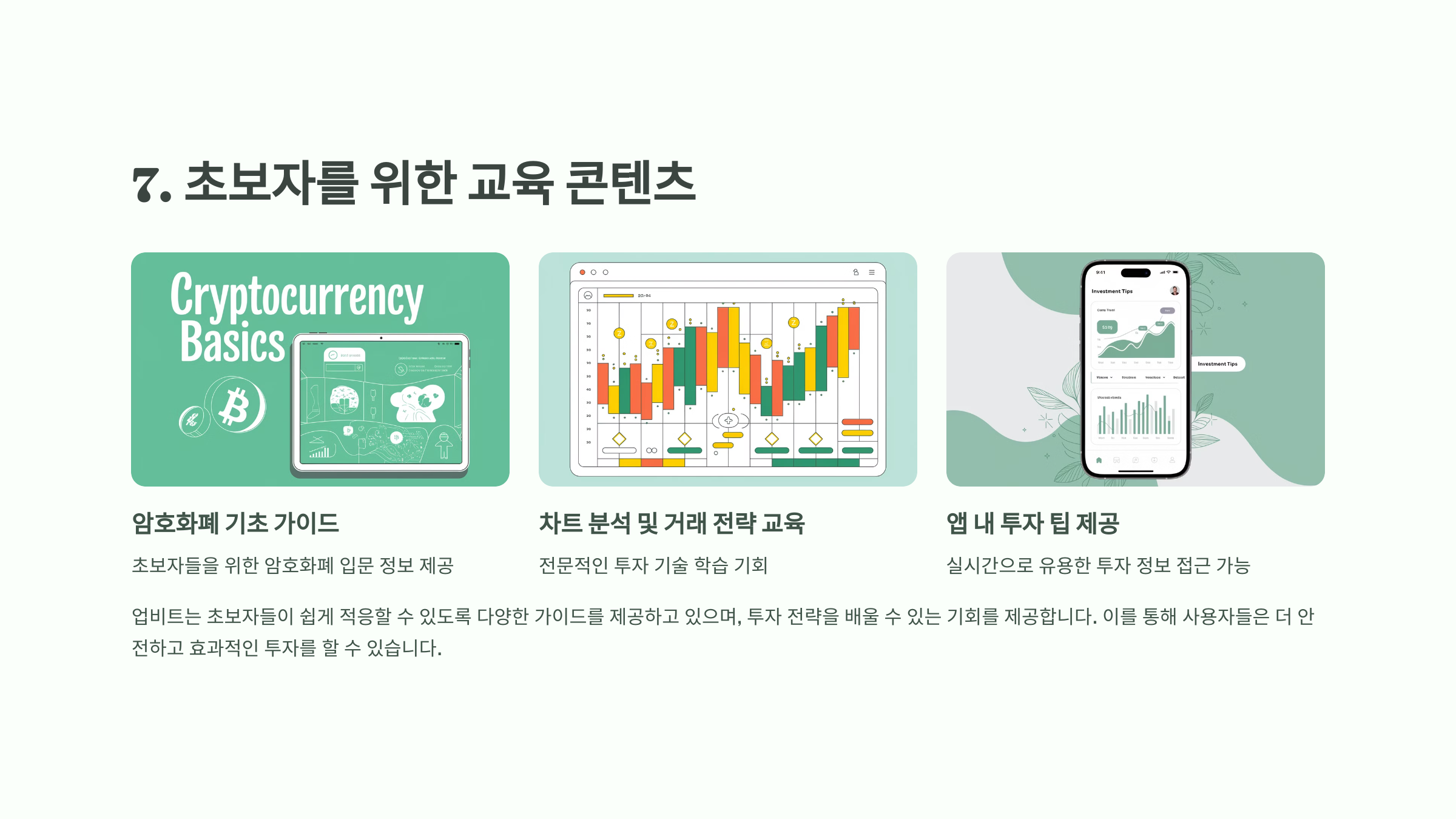 업비트는 초보자들이 쉽게 적응할 수 있도록 다양한 가이드를 제공하고 있으며, 투자 전략을 배울 수 있는 기회를 제공합니다.