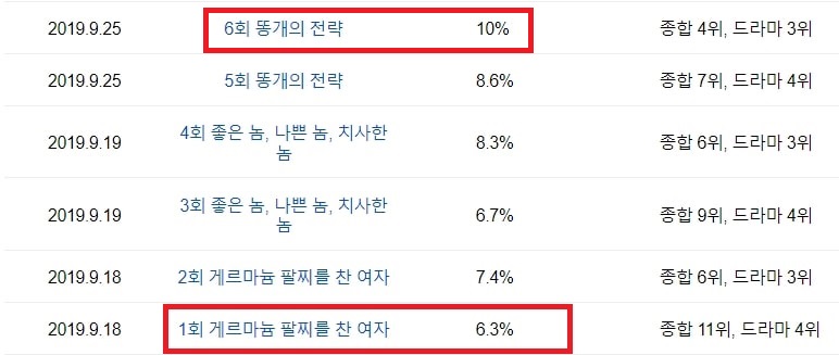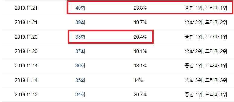 드라마 동백꽃 필 무렵은 총 40부작으로 방영된 작품으로 2019년 9월 18일 1회 첫 방송을 6.3%로 시작해 6회에서 10%, 38회에서는 20.4% 그리고 마지막 방송에서 23.8%의 최고 시청률을 기록하며